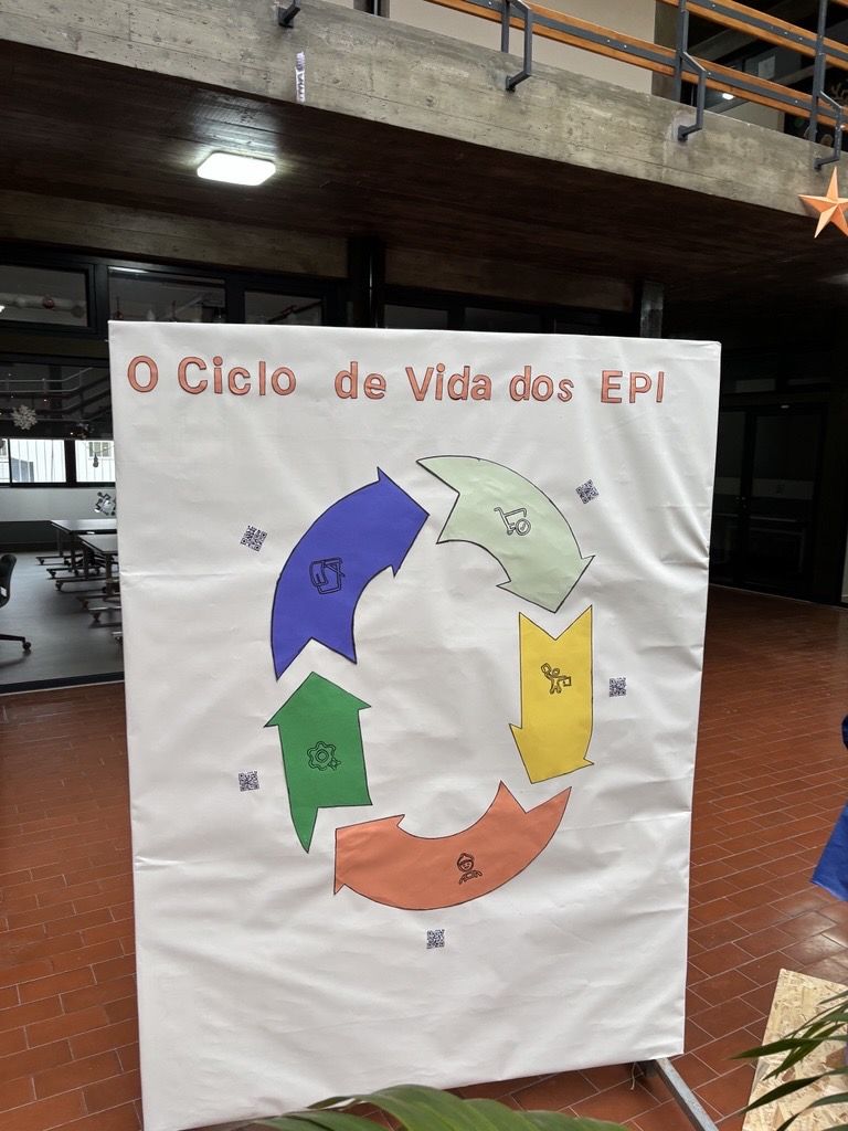 Para complementar o trabalho teórico, os alunos criaram ainda um mural ilustrativo sobre o ciclo de vida dos EPI, destacando as fases de seleção, utilização, manutenção e eliminação correta destes equipamentos. Esta atividade permitiu reforçar a consciência ambiental e a importância da utilização responsável dos recursos.
