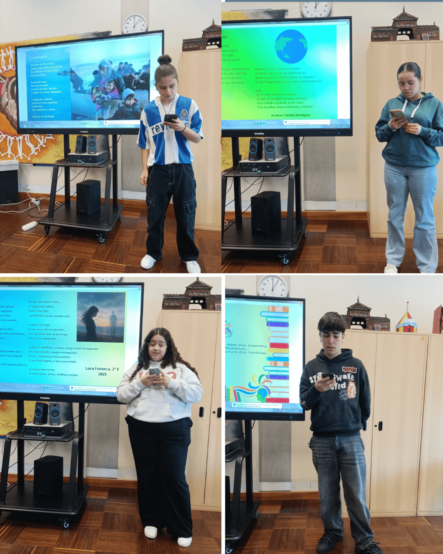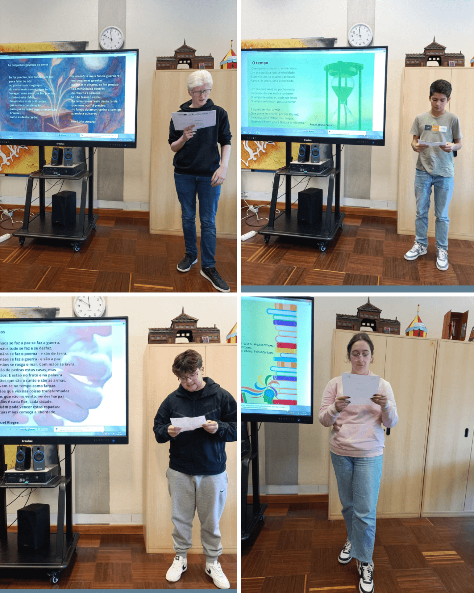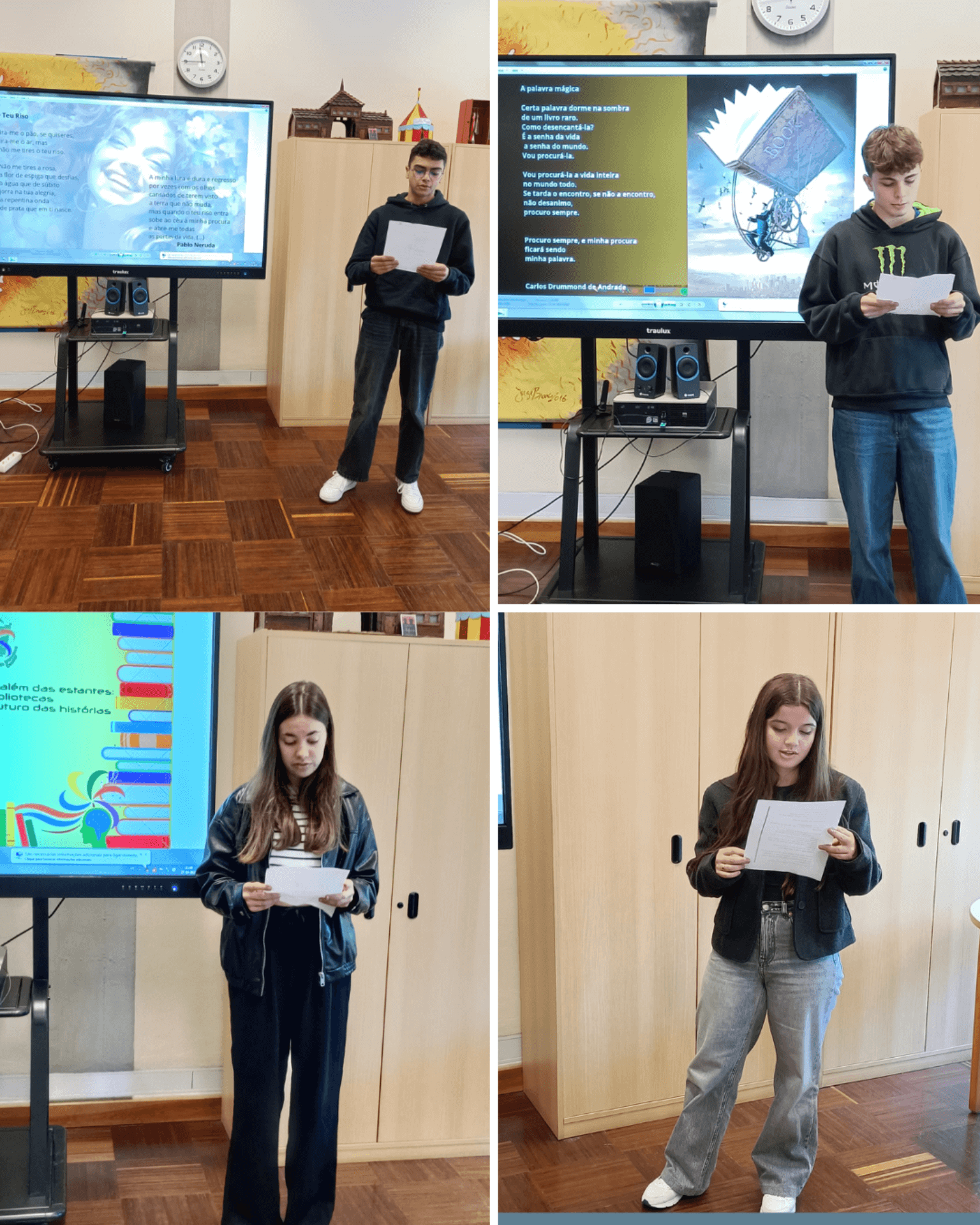 A comemoração ganhou um brilho extra quando duas alunas deram voz aos seus próprios poemas, lembrando-nos de que ler é também escrever com a alma, e escrever é ler o mundo com o coração. Instantes de partilha, emoção e encantamento, em que cada leitura acendeu um brilho novo nos olhos de quem escutava. Saímos de coração cheio, com a certeza de que a literatura continua a ser o caminho mais belo para nos encontrarmos uns aos outros.