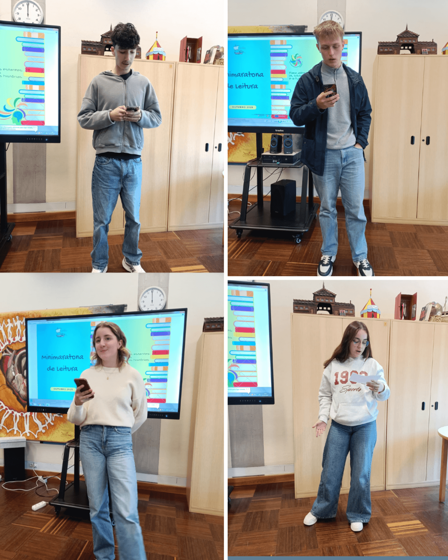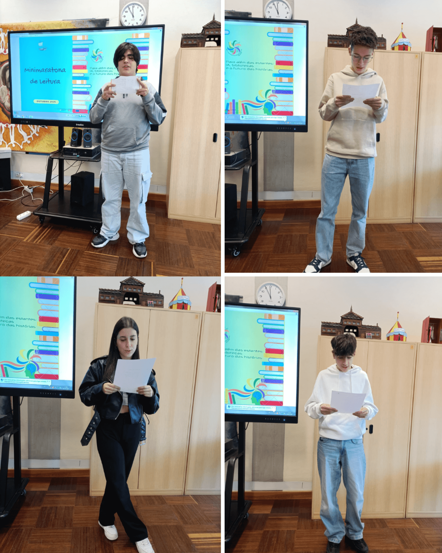 No dia 27 de outubro, o coração da biblioteca pulsou mais forte ao som de uma Minimaratona de Leitura em Português, Inglês e Espanhol, ecoando nas vozes vibrantes de muitos alunos, de três professores, da D. Leninha e na leitura de um poema em uníssono.